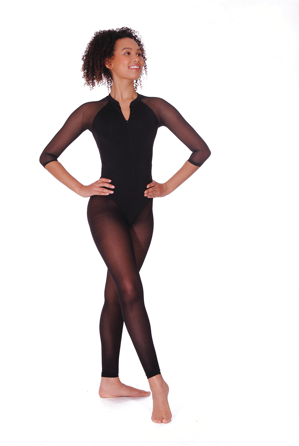 Microfibre three quarter length sleeved turtle-neck leotard with front zip, mesh back panel & sleeves. Fully front lined.