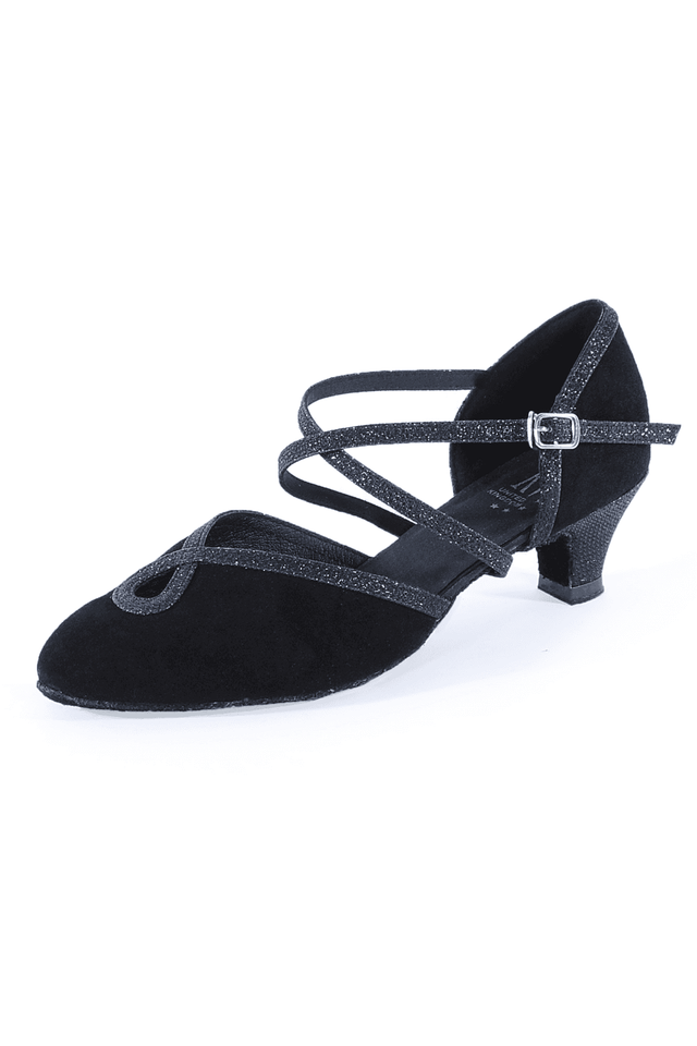 Wide fit ladies ballroom shoes. Spanish heel with nubuck upper and black glitter edging.